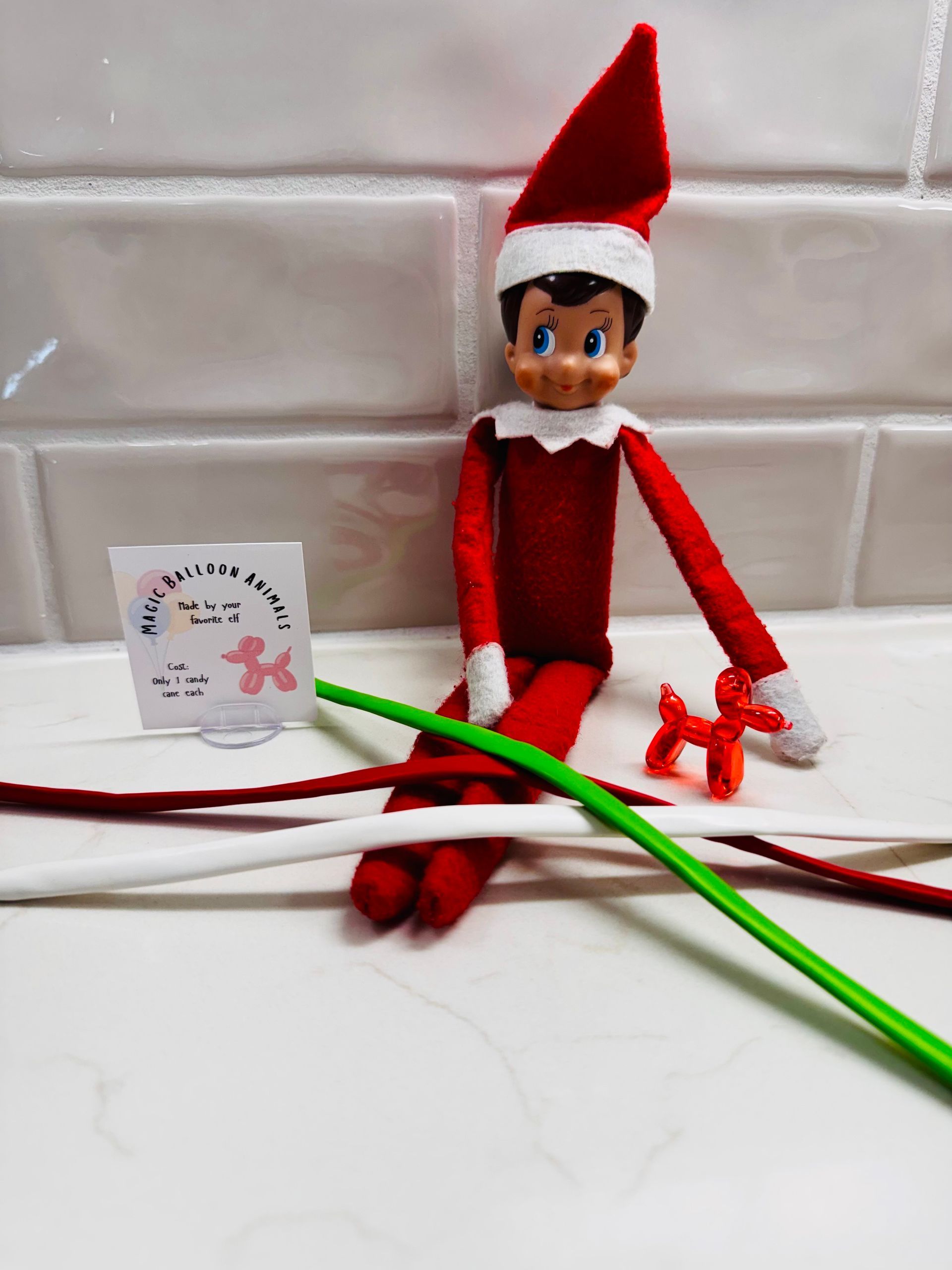 Bet you didn't know elves had so many talents! Set up your elf with his sign, balloons and balloon animal. Place a few friends (toys) nearby to wait for him to make them something too! (The balloons are just for a prop.....don't try to blow them up unless you use a balloon pump! )