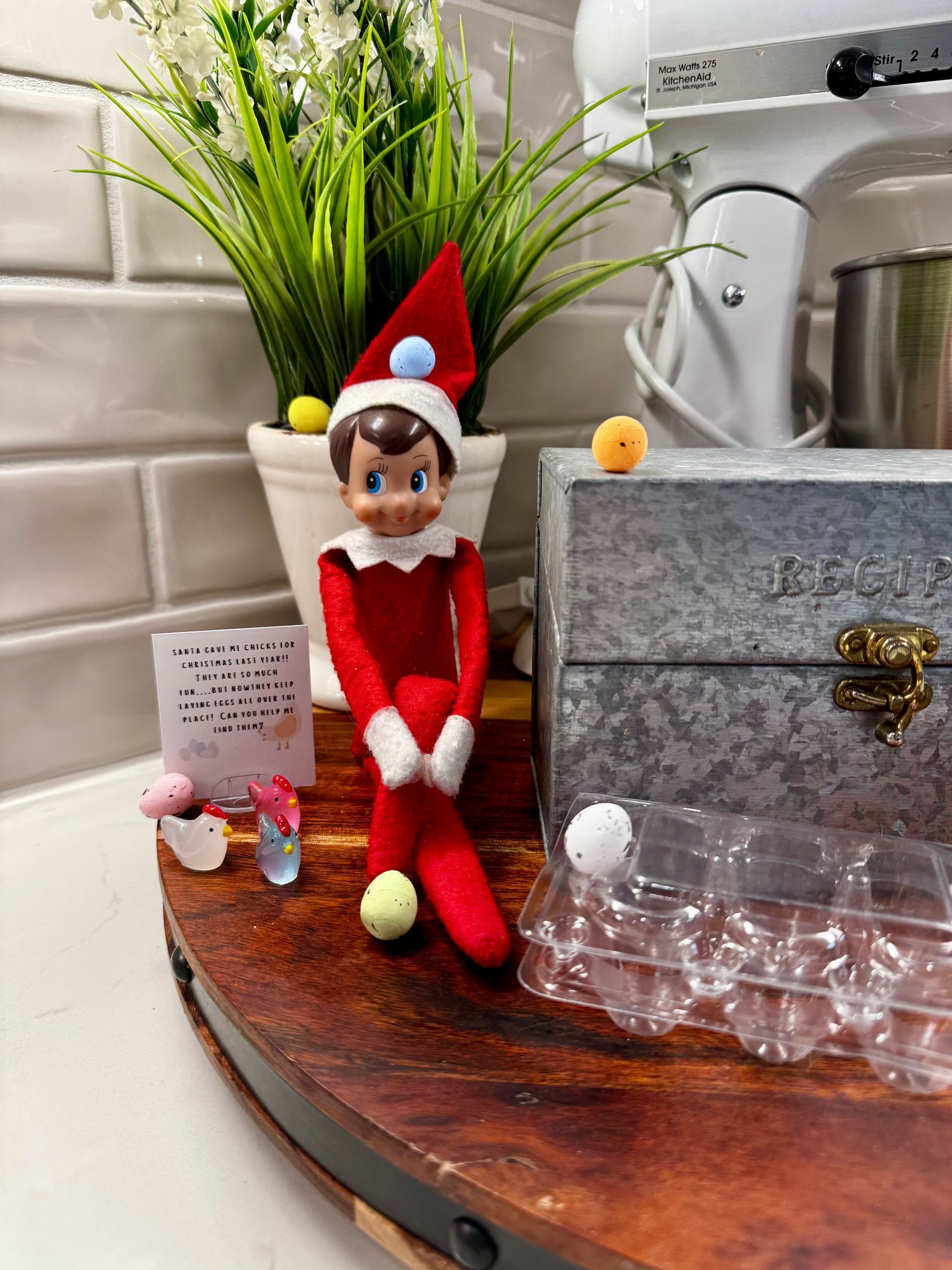 Santa finally let me have chickens! Now they are laying eggs everywhere and I can’t seem to find them! Sit your Elf out with his chickens and the egg holder. Hide all 6 eggs around the house and then the kids can find them!