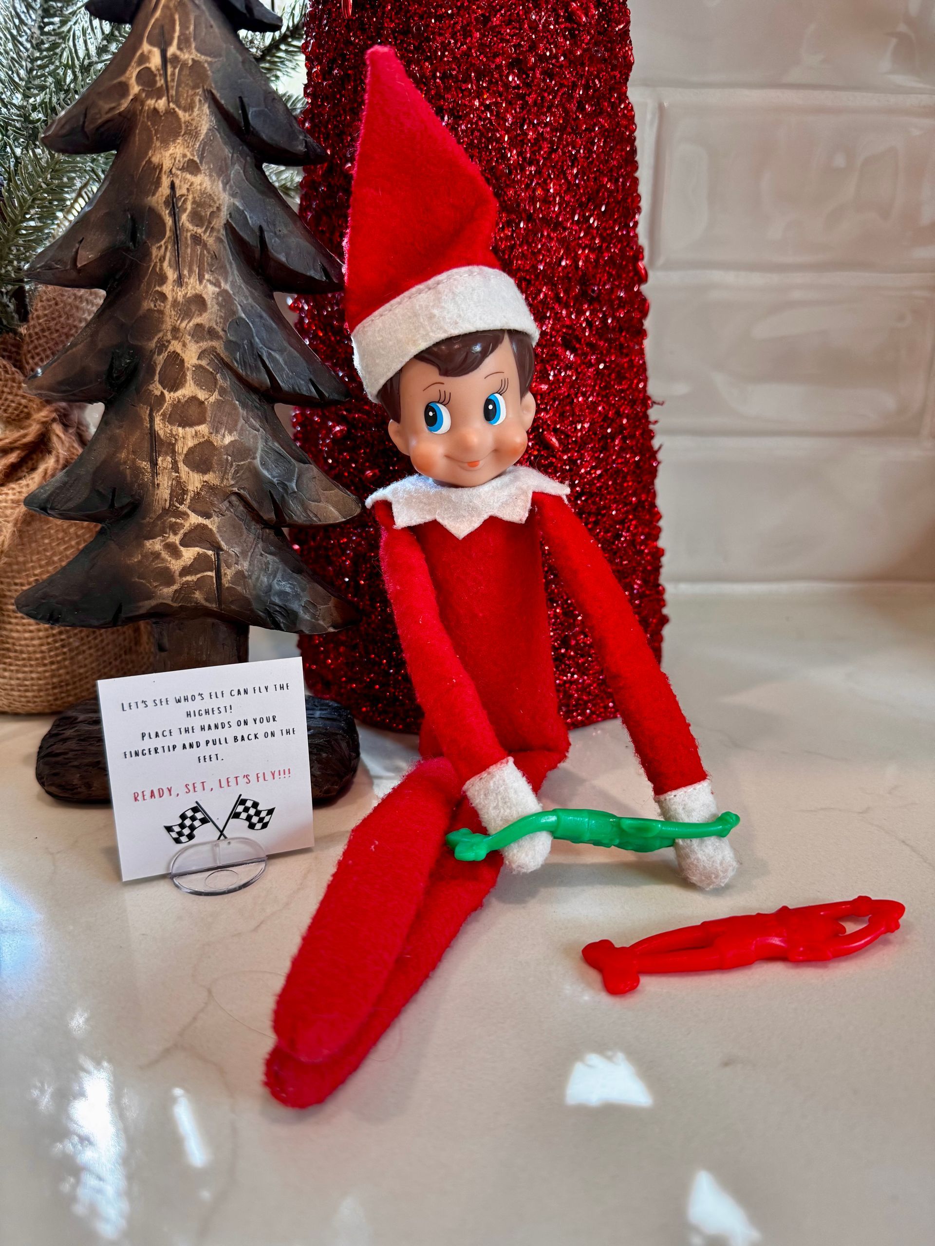 Let's see how high our elf friends can fly! Leave your elf out with the card and flying elves. To use, put the stretchy hands on your pointer finger and pull the feet back with your other hand. Point up to the sky and let go! Let's see who's elf goes the highest!