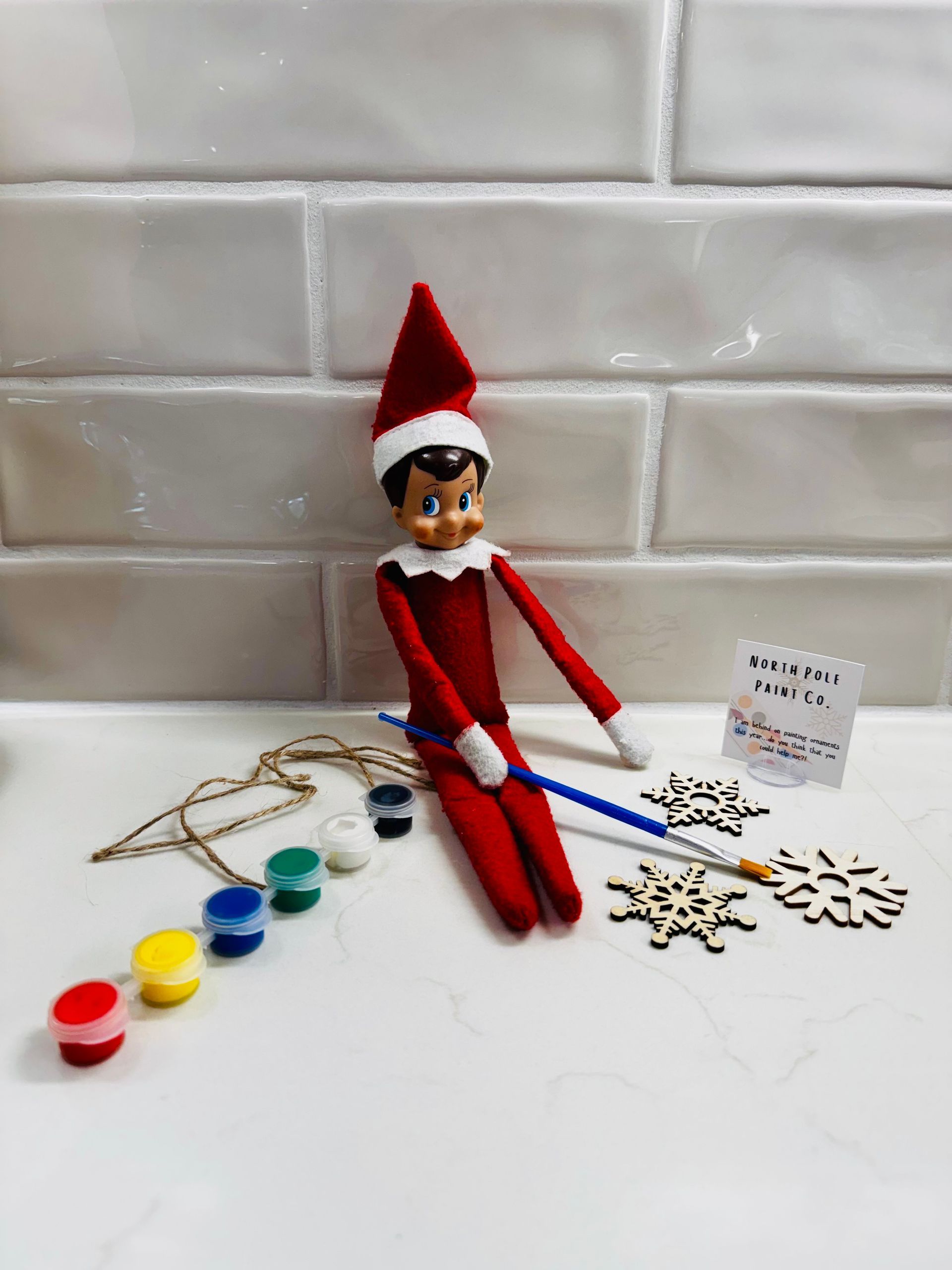 The elf is behind on getting his ornaments painted this year! He needs the kids to help him! Set your elf up with his paints, brush and ornaments. Be sure to put the ornaments on paper or paint them somewhere that wont be too messy! Once they are dry, tie the string to them and hang them on the tree. Your elf will be so happy!