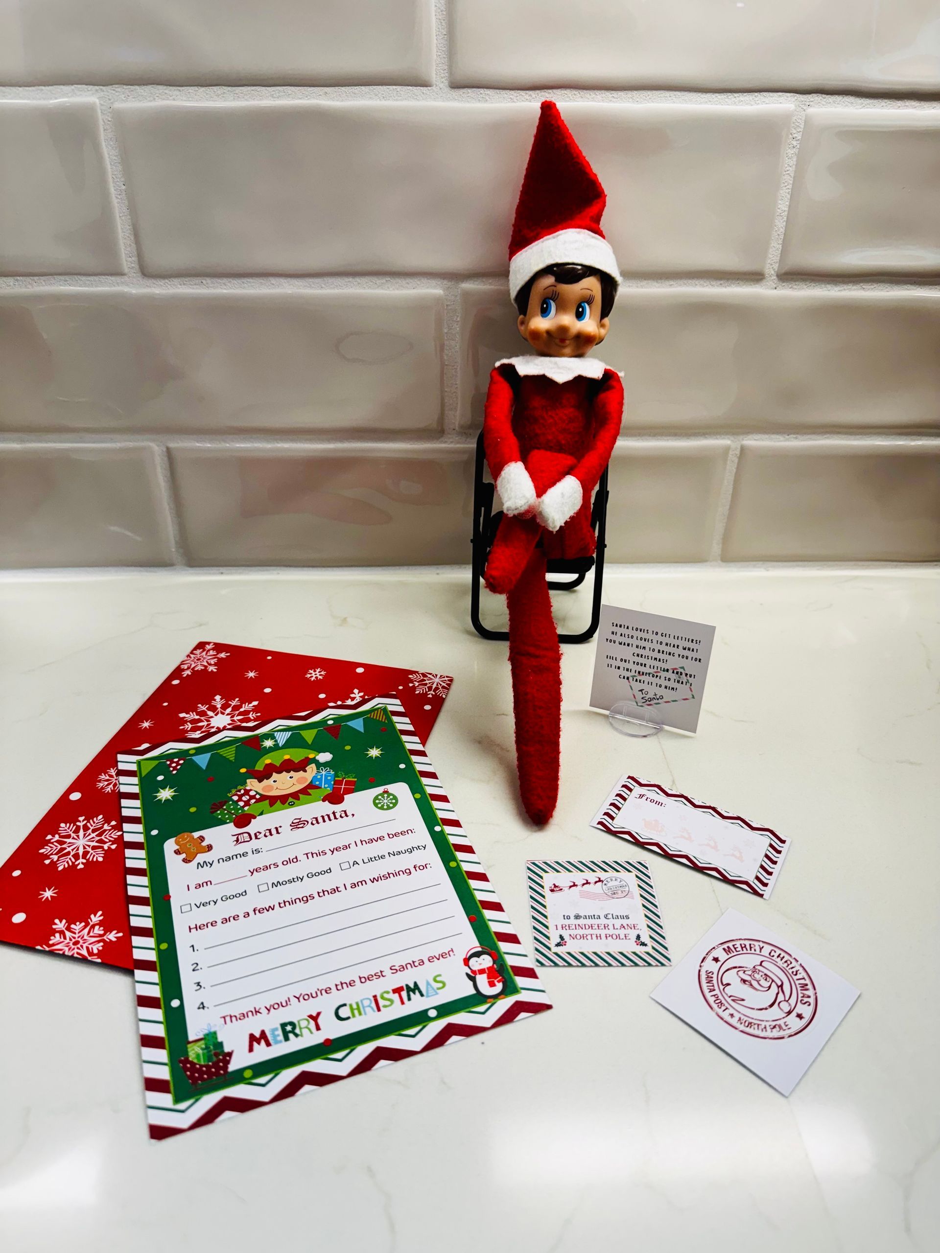We know santa loves to get letters...and it is so helpful when the kids let him know what they want him to bring. Sit your elf out with the letters, envelope, stamp and stickers. Prop his note up next to him. Let's get some letters ready to send!