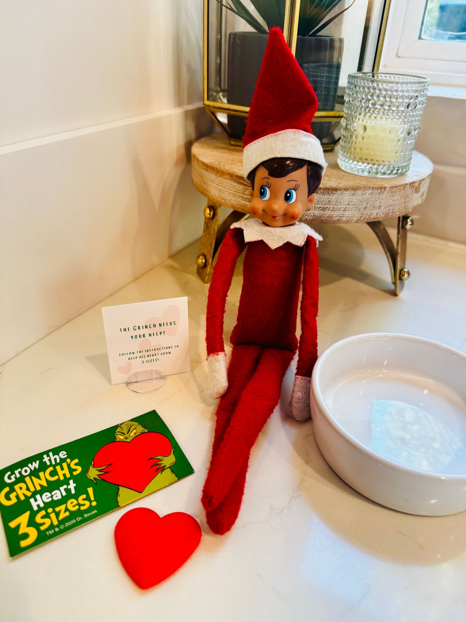 You know how the story goes...the grinch's heart grows three sizes once he realizes what christmas is all about. Well, now he needs a little help to get it there! Place your elf, the card, heart and a bowl of water out and when the kids wake up they can finish the job!