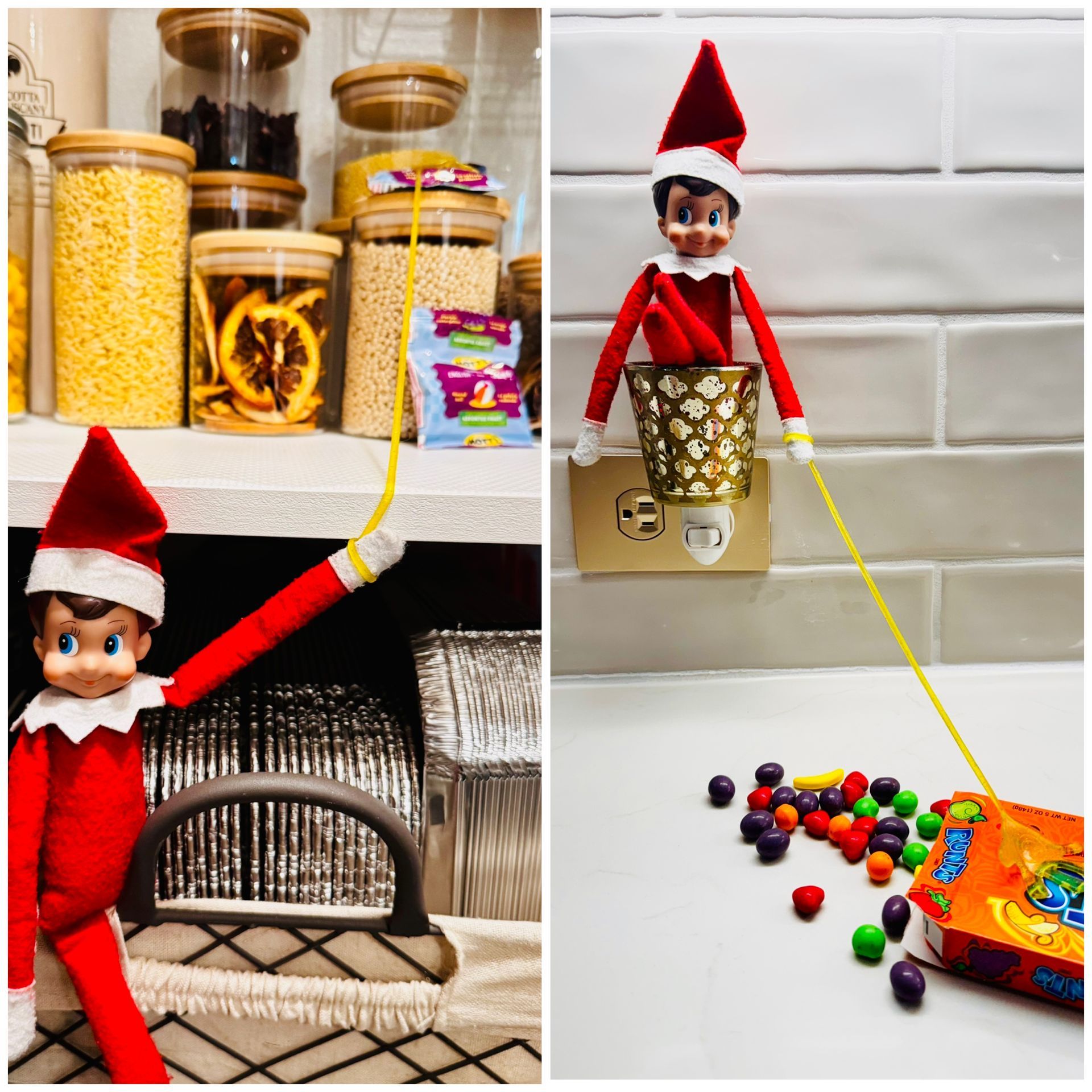 Your elf has got a sweet tooth and has been getting into all kinds of things, looking for something good! Set your elf up in the pantry or by a cabinet. Put the end of one of the stretchy hands on his arm and stick the hand to something yummy (flat, horizontal surfaces seem to stick best) or scatter candy or a box of open treats near him with his hand reaching out for them! Leave the extra hands out for the kids so that they can join in!