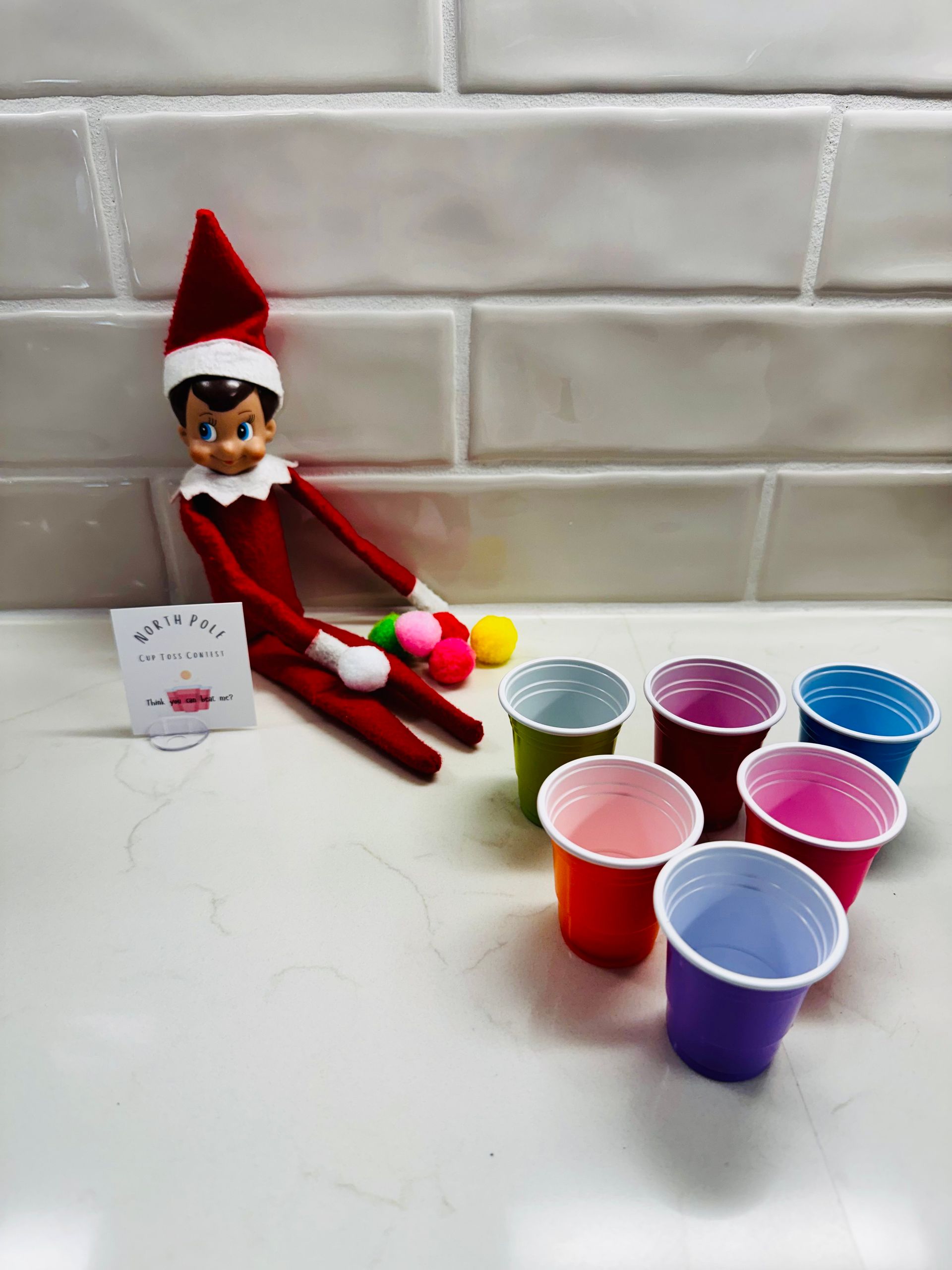 It's the first annual North Pole Cup Toss competition! Set up your cups as shown above. Add a few friends (toys) to come and try to compete! Who can get all of the balls in the cups without missing one?!